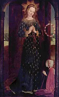 - Soest, Wiesenkirche : panneau vers 1450-1480. (Attribué au Maître westphalien de 1473 ; la donatrice offre la couronne de roses; à droite un prisonnier dont les pieds sont pris dans un carcan.)