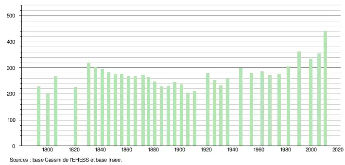 L'évolution du nombre d'habitants est connue à travers les recensements de la population effectués dans la commune depuis 1793. À partir du , les populations légales des communes sont publiées annuellement dans le cadre d'un recensement qui repose désormais sur une collecte d'information annuelle, concernant successivement tous les territoires communaux au cours d'une période de cinq ans. Pour les communes de moins de 10 000 habitants, une enquête de recensement portant sur toute la population est réalisée tous les cinq ans, les populations légales des années intermédiaires étant quant à elles estimées par interpolation ou extrapolation[15]. Pour la commune, le premier recensement exhaustif entrant dans le cadre du nouveau dispositif a été réalisé en 2005[16],[Note 2].