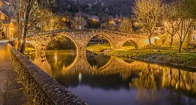 C'est un pont de pierre en dos d'âne à cinq arches ogivales long de 57 m franchissant l'Aveyron (affluent du Tarn). La voirie est pavée et un calvaire en pierre est présent au centre du parapet d'aval[3].