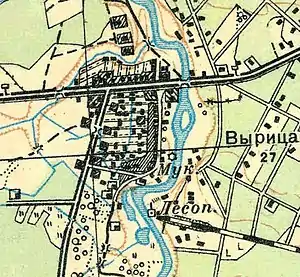 Vyritsa est acheté en 1869 par le prince Wittgenstein ((Peter Dominikus Ludwig, Fürst zu Sayn und Wittgenstein) avec une scierie et un moulin à eau sur la rivière Oredej. En 1877-1878, les paysans libres rachètent des terres au prince[12]. D'après une carte topographique du gouvernement de Saint-Pétersbourg de 1879, le village s'appelle Vyrossitsa et abrite un moulin à eau et quatre fermes[13]. La scierie est remise à neuf en 1884 et dotée d'une machine à vapeur. Au tournant du siècle, il appartient administrativement à la volost de Rojdestvenskaïa de l'ouïezd de Tsarskoïe Selo.