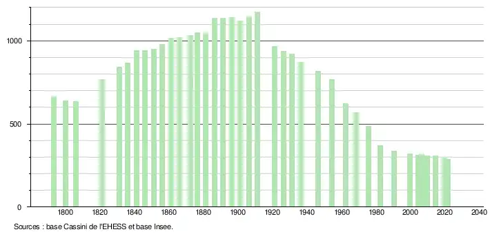 L'évolution du nombre d'habitants est connue à travers les recensements de la population effectués dans la commune depuis 1793. Pour les communes de moins de 10 000 habitants, une enquête de recensement portant sur toute la population est réalisée tous les cinq ans, les populations légales des années intermédiaires étant quant à elles estimées par interpolation ou extrapolation[31]. Pour la commune, le premier recensement exhaustif entrant dans le cadre du nouveau dispositif a été réalisé en 2004[32].