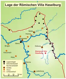 - (de) Cet article est partiellement ou en totalité issu de l’article de Wikipédia en allemand intitulé « Römische Villa Haselburg » (voir la liste des auteurs).