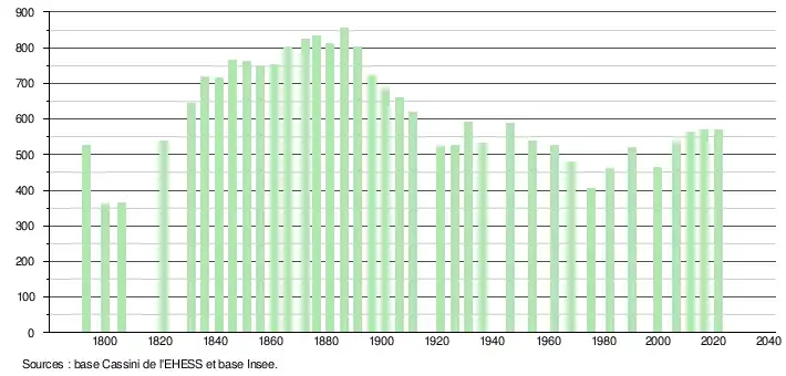 L'évolution du nombre d'habitants est connue à travers les recensements de la population effectués dans la commune depuis 1793. Pour les communes de moins de 10 000 habitants, une enquête de recensement portant sur toute la population est réalisée tous les cinq ans, les populations légales des années intermédiaires étant quant à elles estimées par interpolation ou extrapolation[20]. Pour la commune, le premier recensement exhaustif entrant dans le cadre du nouveau dispositif a été réalisé en 2006[21].