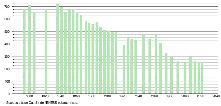 L'évolution du nombre d'habitants est connue à travers les recensements de la population effectués dans la commune depuis 1793. Pour les communes de moins de 10 000 habitants, une enquête de recensement portant sur toute la population est réalisée tous les cinq ans, les populations légales des années intermédiaires étant quant à elles estimées par interpolation ou extrapolation[18]. Pour la commune, le premier recensement exhaustif entrant dans le cadre du nouveau dispositif a été réalisé en 2007[19].