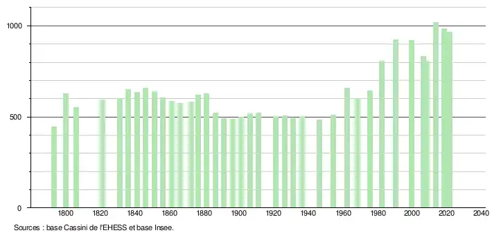 L'évolution du nombre d'habitants est connue à travers les recensements de la population effectués dans la commune depuis 1793. Pour les communes de moins de 10 000 habitants, une enquête de recensement portant sur toute la population est réalisée tous les cinq ans, les populations légales des années intermédiaires étant quant à elles estimées par interpolation ou extrapolation[28]. Pour la commune, le premier recensement exhaustif entrant dans le cadre du nouveau dispositif a été réalisé en 2008[29].