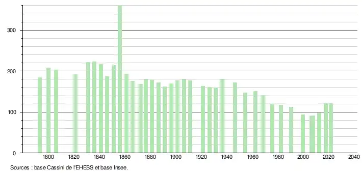 L'évolution du nombre d'habitants est connue à travers les recensements de la population effectués dans la commune depuis 1793. Pour les communes de moins de 10 000 habitants, une enquête de recensement portant sur toute la population est réalisée tous les cinq ans, les populations légales des années intermédiaires étant quant à elles estimées par interpolation ou extrapolation[21]. Pour la commune, le premier recensement exhaustif entrant dans le cadre du nouveau dispositif a été réalisé en 2007[22].