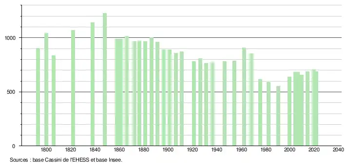 L'évolution du nombre d'habitants est connue à travers les recensements de la population effectués dans la commune depuis 1793. Pour les communes de moins de 10 000 habitants, une enquête de recensement portant sur toute la population est réalisée tous les cinq ans, les populations légales des années intermédiaires étant quant à elles estimées par interpolation ou extrapolation[15]. Pour la commune, le premier recensement exhaustif entrant dans le cadre du nouveau dispositif a été réalisé en 2004[16].
