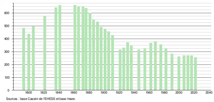 L'évolution du nombre d'habitants est connue à travers les recensements de la population effectués dans la commune depuis 1793. Pour les communes de moins de 10 000 habitants, une enquête de recensement portant sur toute la population est réalisée tous les cinq ans, les populations légales des années intermédiaires étant quant à elles estimées par interpolation ou extrapolation[15]. Pour la commune, le premier recensement exhaustif entrant dans le cadre du nouveau dispositif a été réalisé en 2006[16].