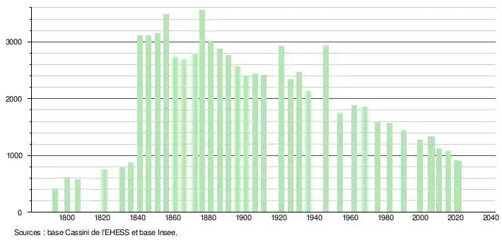 | L'évolution du nombre d'habitants est connue à travers les recensements de la population effectués dans la commune depuis 1793. Pour les communes de moins de 10 000 habitants, une enquête de recensement portant sur toute la population est réalisée tous les cinq ans, les populations légales des années intermédiaires étant quant à elles estimées par interpolation ou extrapolation[17]. Pour la commune, le premier recensement exhaustif entrant dans le cadre du nouveau dispositif a été réalisé en 2005[18]. En 2021, la commune comptait 905 habitants[Note 4], en diminution de 15,97 % par rapport à 2015 (Aube : +0,74 %, France hors Mayotte : +1,84 %). |