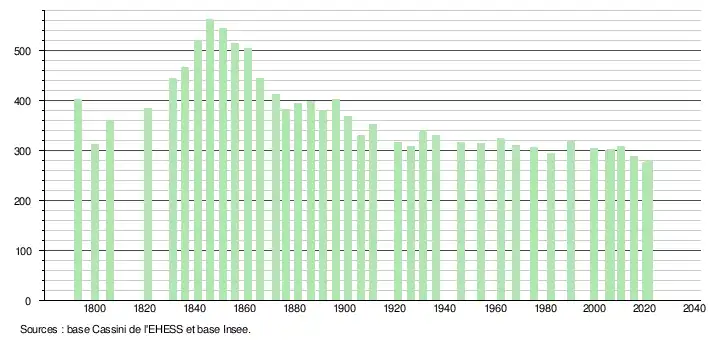 L'évolution du nombre d'habitants est connue à travers les recensements de la population effectués dans la commune depuis 1793. Pour les communes de moins de 10 000 habitants, une enquête de recensement portant sur toute la population est réalisée tous les cinq ans, les populations légales des années intermédiaires étant quant à elles estimées par interpolation ou extrapolation[14]. Pour la commune, le premier recensement exhaustif entrant dans le cadre du nouveau dispositif a été réalisé en 2005[15].