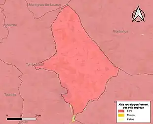 Le retrait-gonflement des sols argileux est susceptible d'engendrer des dommages importants aux bâtiments en cas d’alternance de périodes de sécheresse et de pluie[19]. La totalité de la commune est en aléa moyen ou fort (91,8 % au niveau départemental et 48,5 % au niveau national)[Carte 2]. Depuis le , en application de la loi ELAN, différentes contraintes s'imposent aux vendeurs, maîtres d'ouvrages ou constructeurs de biens situés dans une zone classée en aléa moyen ou fort[Note 3],[20].