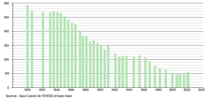 L'évolution du nombre d'habitants est connue à travers les recensements de la population effectués dans la commune depuis 1800. Pour les communes de moins de 10 000 habitants, une enquête de recensement portant sur toute la population est réalisée tous les cinq ans, les populations légales des années intermédiaires étant quant à elles estimées par interpolation ou extrapolation[21]. Pour la commune, le premier recensement exhaustif entrant dans le cadre du nouveau dispositif a été réalisé en 2005[22].