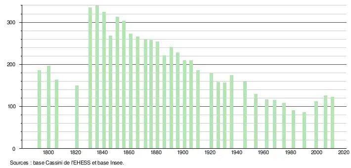 L'évolution du nombre d'habitants est connue à travers les recensements de la population effectués dans la commune depuis 1793. À partir du , les populations légales des communes sont publiées annuellement dans le cadre d'un recensement qui repose désormais sur une collecte d'information annuelle, concernant successivement tous les territoires communaux au cours d'une période de cinq ans. Pour les communes de moins de 10 000 habitants, une enquête de recensement portant sur toute la population est réalisée tous les cinq ans, les populations légales des années intermédiaires étant quant à elles estimées par interpolation ou extrapolation[3]. Pour la commune, le premier recensement exhaustif entrant dans le cadre du nouveau dispositif a été réalisé en 2006[4],[Note 1].