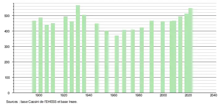 | L'évolution du nombre d'habitants est connue à travers les recensements de la population effectués dans la commune depuis 1896. Pour les communes de moins de 10 000 habitants, une enquête de recensement portant sur toute la population est réalisée tous les cinq ans, les populations légales des années intermédiaires étant quant à elles estimées par interpolation ou extrapolation[27]. Pour la commune, le premier recensement exhaustif entrant dans le cadre du nouveau dispositif a été réalisé en 2008[28]. En 2021, la commune comptait 548 habitants[Note 5], en augmentation de 8,09 % par rapport à 2015 (Aude : +2,47 %, France hors Mayotte : +1,84 %). |
