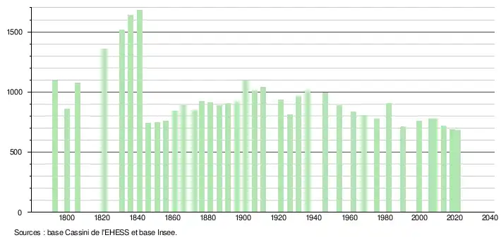 L'évolution du nombre d'habitants est connue à travers les recensements de la population effectués dans la commune depuis 1793. Pour les communes de moins de 10 000 habitants, une enquête de recensement portant sur toute la population est réalisée tous les cinq ans, les populations légales des années intermédiaires étant quant à elles estimées par interpolation ou extrapolation[11]. Pour la commune, le premier recensement exhaustif entrant dans le cadre du nouveau dispositif a été réalisé en 2008[12].
