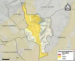 Le retrait-gonflement des sols argileux est susceptible d'engendrer des dommages importants aux bâtiments en cas d’alternance de périodes de sécheresse et de pluie. 44,7 % de la superficie communale est en aléa moyen ou fort (59,3 % au niveau départemental et 48,5 % au niveau national). Sur les 271 bâtiments dénombrés sur la commune en 2019, 234 sont en aléa moyen ou fort, soit 86 %, à comparer aux 85 % au niveau départemental et 54 % au niveau national. Une cartographie de l'exposition du territoire national au retrait gonflement des sols argileux est disponible sur le site du BRGM[21],[Carte 2].