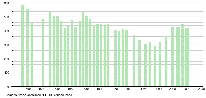 L'évolution du nombre d'habitants est connue à travers les recensements de la population effectués dans la commune depuis 1793. Pour les communes de moins de 10 000 habitants, une enquête de recensement portant sur toute la population est réalisée tous les cinq ans, les populations légales des années intermédiaires étant quant à elles estimées par interpolation ou extrapolation[28]. Pour la commune, le premier recensement exhaustif entrant dans le cadre du nouveau dispositif a été réalisé en 2008[29].