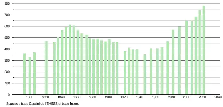 - Population municipale légale en vigueur au 1er janvier 2024, millésimée 2021, définie dans les limites territoriales en vigueur au 1er janvier 2023, date de référence statistique : 1er janvier 2021.
