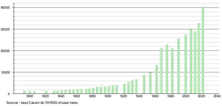 7. Par convention dans Wikipédia, le principe a été retenu de n’afficher dans le tableau des recensements et le graphique, pour les populations légales postérieures à 1999, que les populations correspondant à une enquête exhaustive de recensement pour les communes de moins de 10 000 habitants, et que les populations des années 2006, 2011, 2016, etc. pour les communes de plus de 10 000 habitants, ainsi que la dernière population légale publiée par l’Insee pour l'ensemble des communes.