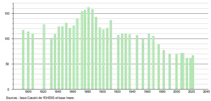 L'évolution du nombre d'habitants est connue à travers les recensements de la population effectués dans la commune depuis 1793. Pour les communes de moins de 10 000 habitants, une enquête de recensement portant sur toute la population est réalisée tous les cinq ans, les populations légales des années intermédiaires étant quant à elles estimées par interpolation ou extrapolation[65]. Pour la commune, le premier recensement exhaustif entrant dans le cadre du nouveau dispositif a été réalisé en 2008[66].