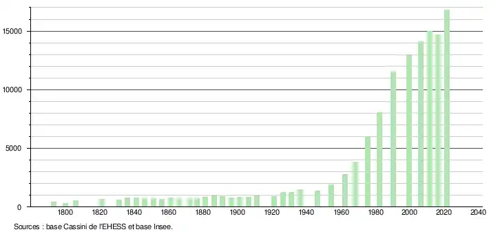 - Par convention dans Wikipédia, le principe a été retenu de n’afficher dans le tableau des recensements et le graphique, pour les populations légales postérieures à 1999, que les populations correspondant à une enquête exhaustive de recensement pour les communes de moins de 10 000 habitants, et que les populations des années 2006, 2011, 2016, etc. pour les communes de plus de 10 000 habitants, ainsi que la dernière population légale publiée par l’Insee pour l'ensemble des communes.