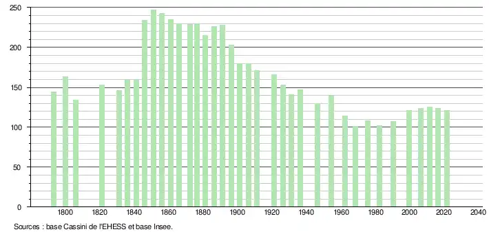 L'évolution du nombre d'habitants est connue à travers les recensements de la population effectués dans la commune depuis 1793. Pour les communes de moins de 10 000 habitants, une enquête de recensement portant sur toute la population est réalisée tous les cinq ans, les populations légales des années intermédiaires étant quant à elles estimées par interpolation ou extrapolation[21]. Pour la commune, le premier recensement exhaustif entrant dans le cadre du nouveau dispositif a été réalisé en 2006[22].
