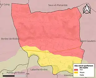 Le retrait-gonflement des sols argileux est susceptible d'engendrer des dommages importants aux bâtiments en cas d’alternance de périodes de sécheresse et de pluie. La totalité de la commune est en aléa moyen ou fort (88,8 % au niveau départemental et 48,5 % au niveau national). Sur les 796 bâtiments dénombrés sur la commune en 2019, 796 sont en aléa moyen ou fort, soit 100 %, à comparer aux 98 % au niveau départemental et 54 % au niveau national. Une cartographie de l'exposition du territoire national au retrait gonflement des sols argileux est disponible sur le site du BRGM[34],[Carte 3].