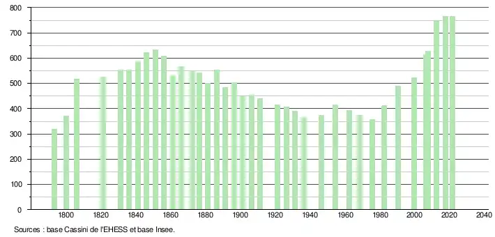 L'évolution du nombre d'habitants est connue à travers les recensements de la population effectués dans la commune depuis 1793. Pour les communes de moins de 10 000 habitants, une enquête de recensement portant sur toute la population est réalisée tous les cinq ans, les populations légales des années intermédiaires étant quant à elles estimées par interpolation ou extrapolation[36]. Pour la commune, le premier recensement exhaustif entrant dans le cadre du nouveau dispositif a été réalisé en 2007[37].