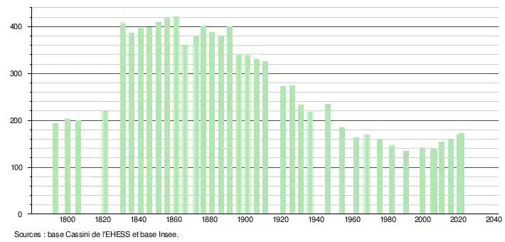 L'évolution du nombre d'habitants est connue à travers les recensements de la population effectués dans la commune depuis 1793. Pour les communes de moins de 10 000 habitants, une enquête de recensement portant sur toute la population est réalisée tous les cinq ans, les populations légales des années intermédiaires étant quant à elles estimées par interpolation ou extrapolation[16]. Pour la commune, le premier recensement exhaustif entrant dans le cadre du nouveau dispositif a été réalisé en 2005[17].