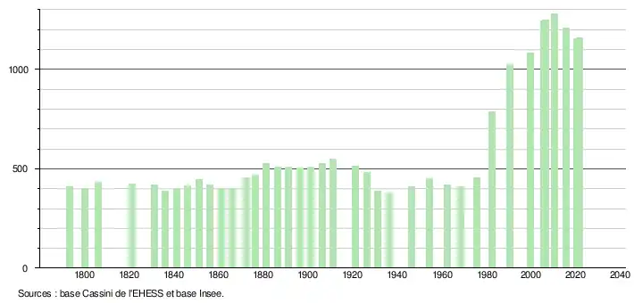 L'évolution du nombre d'habitants est connue à travers les recensements de la population effectués dans la commune depuis 1793. Pour les communes de moins de 10 000 habitants, une enquête de recensement portant sur toute la population est réalisée tous les cinq ans, les populations légales des années intermédiaires étant quant à elles estimées par interpolation ou extrapolation[21]. Pour la commune, le premier recensement exhaustif entrant dans le cadre du nouveau dispositif a été réalisé en 2005[22].