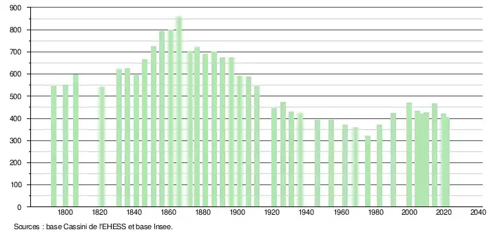 L'évolution du nombre d'habitants est connue à travers les recensements de la population effectués dans la commune depuis 1793. Pour les communes de moins de 10 000 habitants, une enquête de recensement portant sur toute la population est réalisée tous les cinq ans, les populations légales des années intermédiaires étant quant à elles estimées par interpolation ou extrapolation[22]. Pour la commune, le premier recensement exhaustif entrant dans le cadre du nouveau dispositif a été réalisé en 2004[23].