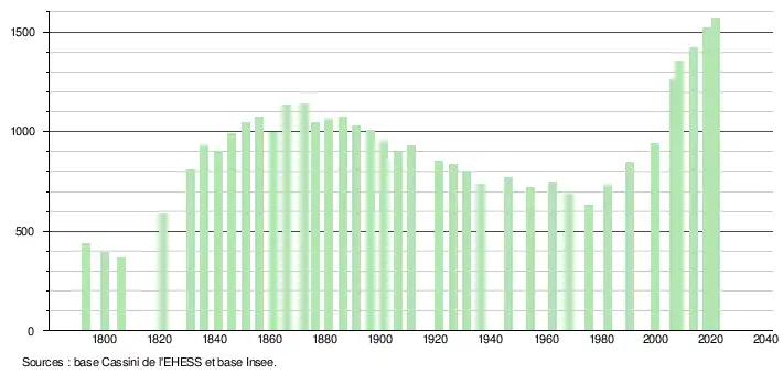 L'évolution du nombre d'habitants est connue à travers les recensements de la population effectués dans la commune depuis 1793. Pour les communes de moins de 10 000 habitants, une enquête de recensement portant sur toute la population est réalisée tous les cinq ans, les populations légales des années intermédiaires étant quant à elles estimées par interpolation ou extrapolation[26]. Pour la commune, le premier recensement exhaustif entrant dans le cadre du nouveau dispositif a été réalisé en 2008[27].