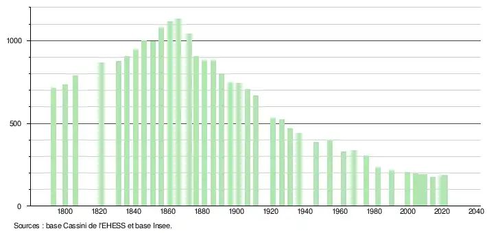 L'évolution du nombre d'habitants est connue à travers les recensements de la population effectués dans la commune depuis 1793. Pour les communes de moins de 10 000 habitants, une enquête de recensement portant sur toute la population est réalisée tous les cinq ans, les populations légales des années intermédiaires étant quant à elles estimées par interpolation ou extrapolation[19]. Pour la commune, le premier recensement exhaustif entrant dans le cadre du nouveau dispositif a été réalisé en 2004[20].