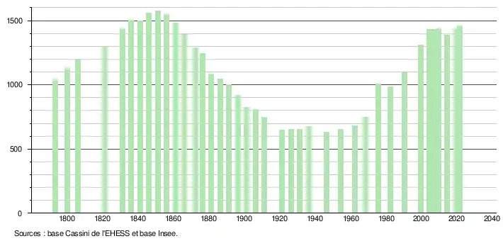 L'évolution du nombre d'habitants est connue à travers les recensements de la population effectués dans la commune depuis 1793. Pour les communes de moins de 10 000 habitants, une enquête de recensement portant sur toute la population est réalisée tous les cinq ans, les populations légales des années intermédiaires étant quant à elles estimées par interpolation ou extrapolation[26]. Pour la commune, le premier recensement exhaustif entrant dans le cadre du nouveau dispositif a été réalisé en 2004[27].