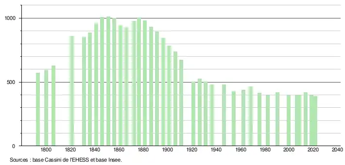 L'évolution du nombre d'habitants est connue à travers les recensements de la population effectués dans la commune depuis 1793. Pour les communes de moins de 10 000 habitants, une enquête de recensement portant sur toute la population est réalisée tous les cinq ans, les populations légales des années intermédiaires étant quant à elles estimées par interpolation ou extrapolation[33]. Pour la commune, le premier recensement exhaustif entrant dans le cadre du nouveau dispositif a été réalisé en 2008[34].