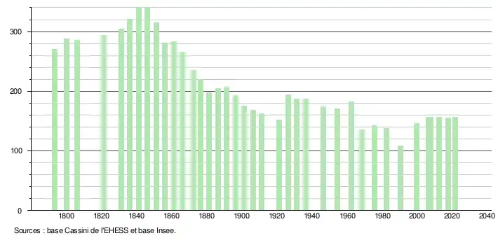 L'évolution du nombre d'habitants est connue à travers les recensements de la population effectués dans la commune depuis 1793. Pour les communes de moins de 10 000 habitants, une enquête de recensement portant sur toute la population est réalisée tous les cinq ans, les populations légales des années intermédiaires étant quant à elles estimées par interpolation ou extrapolation[20]. Pour la commune, le premier recensement exhaustif entrant dans le cadre du nouveau dispositif a été réalisé en 2007[21].