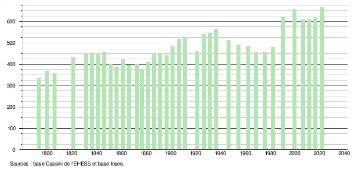 L'évolution du nombre d'habitants est connue à travers les recensements de la population effectués dans la commune depuis 1793. Pour les communes de moins de 10 000 habitants, une enquête de recensement portant sur toute la population est réalisée tous les cinq ans, les populations légales des années intermédiaires étant quant à elles estimées par interpolation ou extrapolation[19]. Pour la commune, le premier recensement exhaustif entrant dans le cadre du nouveau dispositif a été réalisé en 2006[20].