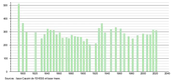 | L'évolution du nombre d'habitants est connue à travers les recensements de la population effectués dans la commune depuis 1793. Pour les communes de moins de 10 000 habitants, une enquête de recensement portant sur toute la population est réalisée tous les cinq ans, les populations légales des années intermédiaires étant quant à elles estimées par interpolation ou extrapolation[20]. Pour la commune, le premier recensement exhaustif entrant dans le cadre du nouveau dispositif a été réalisé en 2006[21]. En 2021, la commune comptait 312 habitants[Note 3], en augmentation de 0,32 % par rapport à 2015 (Eure : −0,5 %, France hors Mayotte : +1,84 %). |