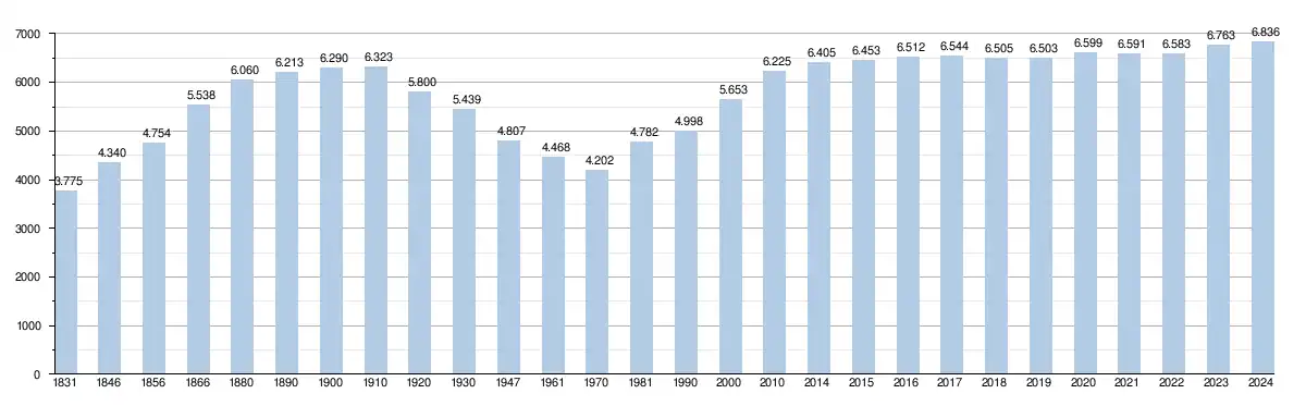 Les chiffres des années 1831 à 1970 tiennent compte des chiffres des anciennes communes fusionnées.