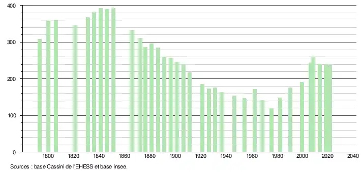 L'évolution du nombre d'habitants est connue à travers les recensements de la population effectués dans la commune depuis 1793. Pour les communes de moins de 10 000 habitants, une enquête de recensement portant sur toute la population est réalisée tous les cinq ans, les populations légales des années intermédiaires étant quant à elles estimées par interpolation ou extrapolation[18]. Pour la commune, le premier recensement exhaustif entrant dans le cadre du nouveau dispositif a été réalisé en 2008[19].