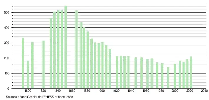L'évolution du nombre d'habitants est connue à travers les recensements de la population effectués dans la commune depuis 1793. Pour les communes de moins de 10 000 habitants, une enquête de recensement portant sur toute la population est réalisée tous les cinq ans, les populations légales des années intermédiaires étant quant à elles estimées par interpolation ou extrapolation[15]. Pour la commune, le premier recensement exhaustif entrant dans le cadre du nouveau dispositif a été réalisé en 2006[16].
