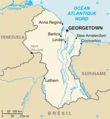 - (de) Cet article est partiellement ou en totalité issu de l’article de Wikipédia en allemand intitulé « Liste der Städte in Guyana » (voir la liste des auteurs).