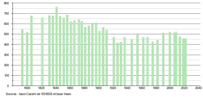 L'évolution du nombre d'habitants est connue à travers les recensements de la population effectués dans la commune depuis 1793. Pour les communes de moins de 10 000 habitants, une enquête de recensement portant sur toute la population est réalisée tous les cinq ans, les populations légales des années intermédiaires étant quant à elles estimées par interpolation ou extrapolation[26]. Pour la commune, le premier recensement exhaustif entrant dans le cadre du nouveau dispositif a été réalisé en 2008[27].
