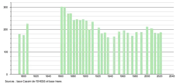 L'évolution du nombre d'habitants est connue à travers les recensements de la population effectués dans la commune depuis 1793. Pour les communes de moins de 10 000 habitants, une enquête de recensement portant sur toute la population est réalisée tous les cinq ans, les populations légales des années intermédiaires étant quant à elles estimées par interpolation ou extrapolation[18]. Pour la commune, le premier recensement exhaustif entrant dans le cadre du nouveau dispositif a été réalisé en 2007[19].