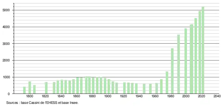 L'évolution du nombre d'habitants est connue à travers les recensements de la population effectués dans la commune depuis 1793. Pour les communes de moins de 10 000 habitants, une enquête de recensement portant sur toute la population est réalisée tous les cinq ans, les populations légales des années intermédiaires étant quant à elles estimées par interpolation ou extrapolation[19]. Pour la commune, le premier recensement exhaustif entrant dans le cadre du nouveau dispositif a été réalisé en 2007[20].