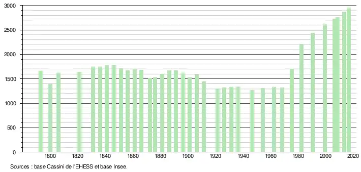 L'évolution du nombre d'habitants est connue à travers les recensements de la population effectués dans la commune depuis 1793. Pour les communes de moins de 10 000 habitants, une enquête de recensement portant sur toute la population est réalisée tous les cinq ans, les populations légales des années intermédiaires étant quant à elles estimées par interpolation ou extrapolation[21]. Pour la commune, le premier recensement exhaustif entrant dans le cadre du nouveau dispositif a été réalisé en 2008[22].