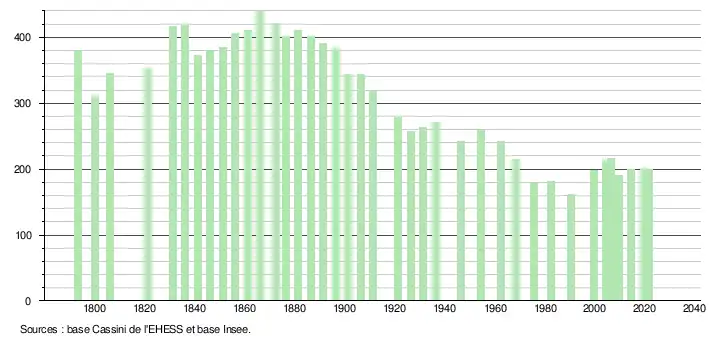 L'évolution du nombre d'habitants est connue à travers les recensements de la population effectués dans la commune depuis 1793. Pour les communes de moins de 10 000 habitants, une enquête de recensement portant sur toute la population est réalisée tous les cinq ans, les populations légales des années intermédiaires étant quant à elles estimées par interpolation ou extrapolation[63]. Pour la commune, le premier recensement exhaustif entrant dans le cadre du nouveau dispositif a été réalisé en 2004[64].