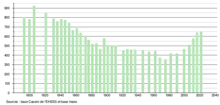 L'évolution du nombre d'habitants est connue à travers les recensements de la population effectués dans la commune depuis 1793. Pour les communes de moins de 10 000 habitants, une enquête de recensement portant sur toute la population est réalisée tous les cinq ans, les populations légales des années intermédiaires étant quant à elles estimées par interpolation ou extrapolation[24]. Pour la commune, le premier recensement exhaustif entrant dans le cadre du nouveau dispositif a été réalisé en 2006[25].