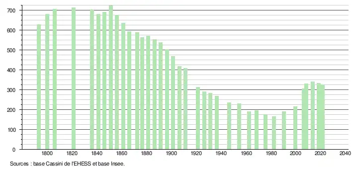 L'évolution du nombre d'habitants est connue à travers les recensements de la population effectués dans la commune depuis 1793. Pour les communes de moins de 10 000 habitants, une enquête de recensement portant sur toute la population est réalisée tous les cinq ans, les populations légales des années intermédiaires étant quant à elles estimées par interpolation ou extrapolation[20]. Pour la commune, le premier recensement exhaustif entrant dans le cadre du nouveau dispositif a été réalisé en 2008[21].