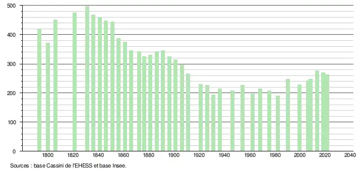 L'évolution du nombre d'habitants est connue à travers les recensements de la population effectués dans la commune depuis 1793. Pour les communes de moins de 10 000 habitants, une enquête de recensement portant sur toute la population est réalisée tous les cinq ans, les populations légales des années intermédiaires étant quant à elles estimées par interpolation ou extrapolation[23]. Pour la commune, le premier recensement exhaustif entrant dans le cadre du nouveau dispositif a été réalisé en 2008[24].